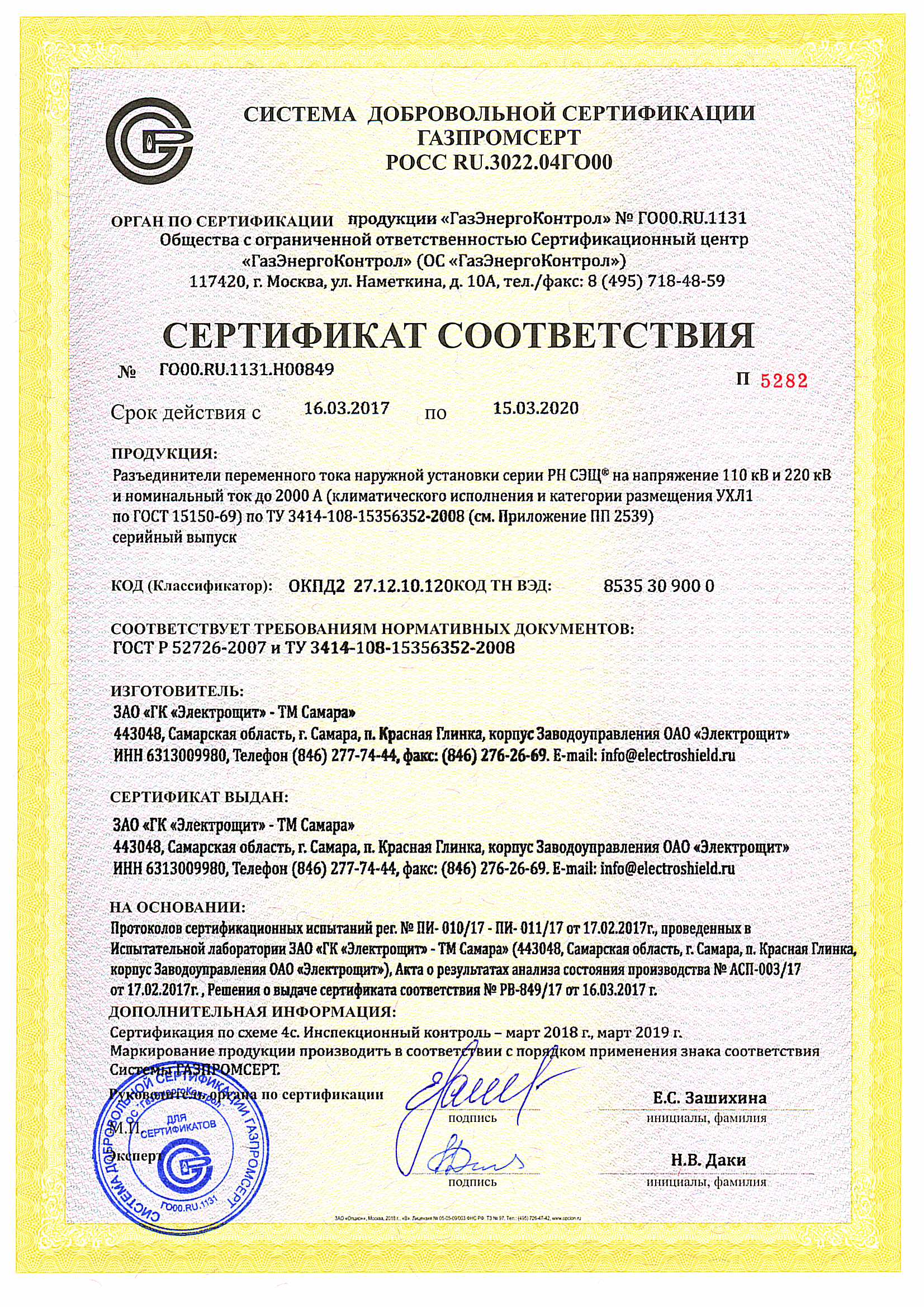 Разъединители изготавливаются в однополюсном и трехполюсном исполнении. Конструкция разъединителей, как для главных, так и для заземляющих ножей, предусматривает установку следующих типов приводов: ПД СЭЩ (двигательный), ПР(М) СЭЩ (ручной). На разъединитель могут устанавливаться как фарфоровые, так и полимерные изоляторы. Возможна установка специальных защитных козырьков. Разъединитель РН-СЭЩ 220 аттестован в ПАО "Россети".
